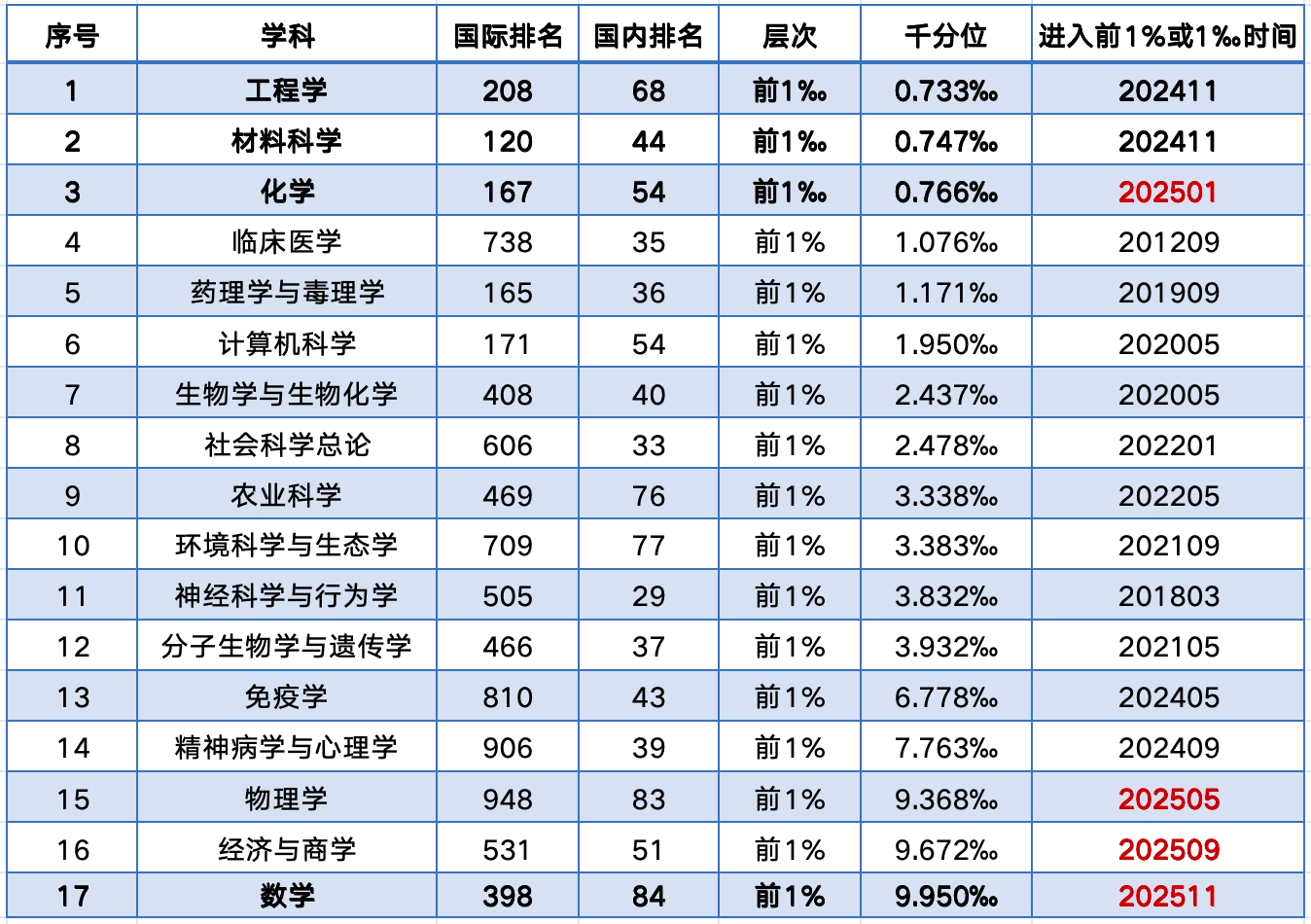 除数学外,其他上榜学科中,工程学(0.73‰)、材料科学(0.75‰)、化学(0.77‰)位列全球排名前1‰;临床医学(1.08‰)、药理学与毒理学(1.17‰)、计算机科学(1.95‰)位列全球前2‰;生物学与生物化学(2.44‰)、社会科学总论(2.48‰)位列全球前3‰;农业科学(3.34‰)、环境科学与生态学(3.38‰)、神经科学与行为科学(3.83‰)、分子生物学与遗传学(3.93‰)位列全球前5‰;免疫学(6.78‰)、精神病学与心理学(7.76‰)、物理学(9.37‰)、经济与商业(9.67‰)位列全球前1%。