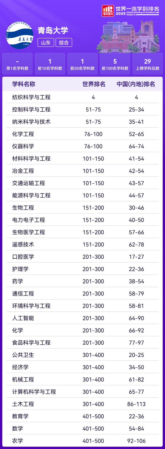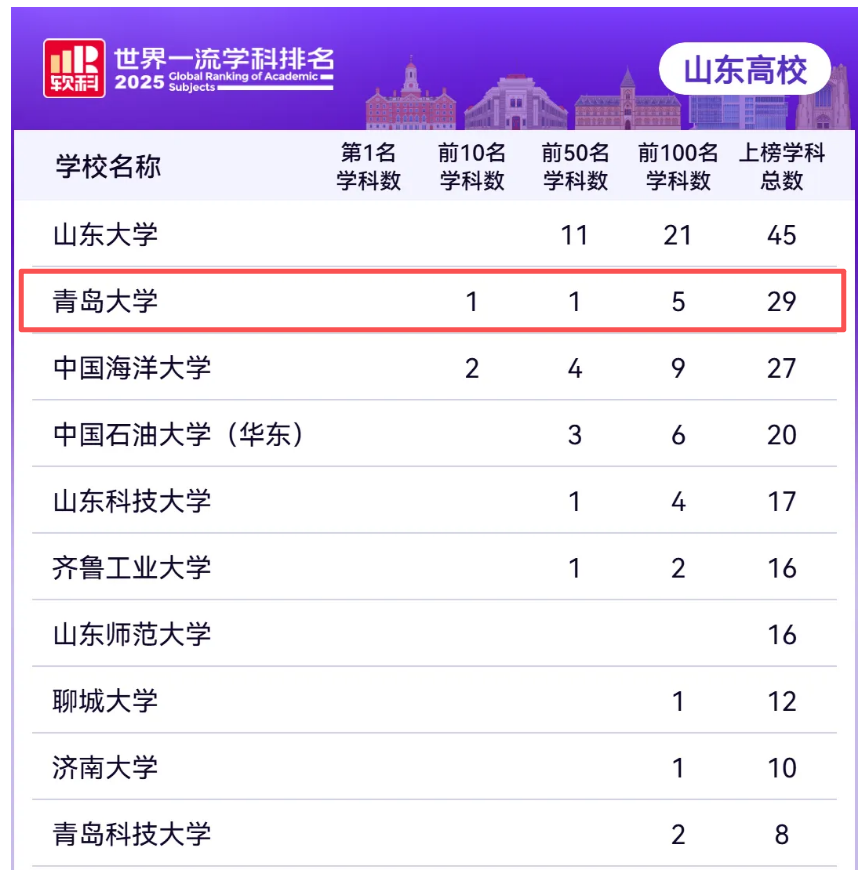 11月18日,高等教育评价专业机构软科正式发布2025“软科世界一流学科排名”(ShanghaiRanking's Global Ranking of Academic Subjects,简称GRAS)。青岛大学共29个学科上榜,较去年新增5个学科;上榜学科总数并列全国第33位,较去年上升7位。在非“双一流”高校中位列第2位,在山东省属高校中位列第1位。